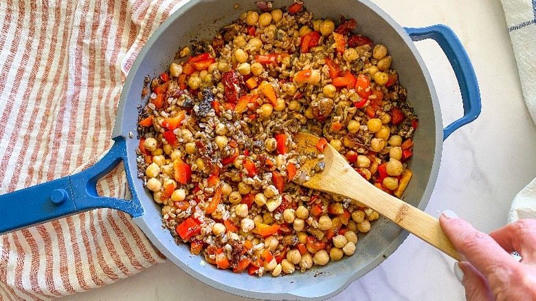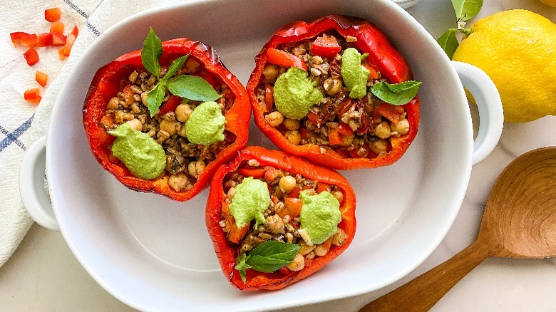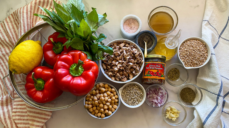 To make this recipe, we'll of course need some bell peppers. "You can use any color of pepper that you prefer. I always look for the biggest ones I can find so you can fit lots of filling inside," Hahn shares. The other produce items we need are a shallot, mushrooms, garlic, fresh basil, and one lemon. If you'll be using farro as your grain of choice, pick up some of that and Hahn assures us either the quick cooking or standard type is fine. For spices, grab some fennel seeds, Italian seasonings, salt, and pepper. Then to round out our list, pick up some olive oil, sun-dried tomatoes, vegetable broth, garbanzo beans, and sunflower seeds.