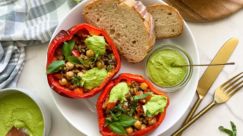 Wellness coach and recipe developer Miriam Hahn brings us this recipe and says, "I grew up eating stuffed peppers frequently. My mom made different variations, but this Italian-style version was always my favorite. I am using farro here, but you can use rice, quinoa, or any grain. It's actually a great recipe to make when you have leftover rice or farro that you want to use up. The fresh pesto takes less than 5 minutes to make and is a flavorful topper!"