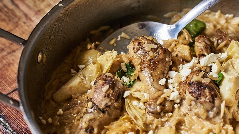 Add the chicken and artichokes first, before sprinkling in the orzo. You might be tempted to add the orzo first to more easily submerge it in broth, but we don't recommend this because the pasta then gets stuck underneath the chicken and melts into the bottom of the skillet, leading to a burnt, sticky mess. Add the chicken first, bring the broth to a boil, then sprinkle the orzo around the meat and submerge as much as possible. Lower the heat to a steady simmer and cover to trap in the steam. To ensure the orzo isn't sticking to the bottom, stir every few minutes.