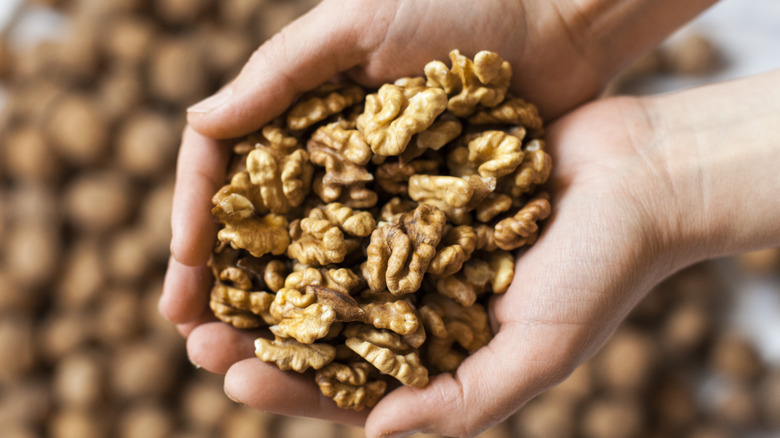 The thing about straight-up coffee cake is that there isn't much to break up the texture. It's all soft and sugary. That's perfectly fine, and we love it that way, but if you want to knock your cake out of the park, you might want to bring in a textural highlight to the cake. Want to know why Snickers are so darn good? It's because of the peanuts. Some people might like the taste of peanuts, but really, it's that nice crunch that elevates the candy bar. You can Snicker up your coffee cake with your own introduction of nuts to the top. Peanuts might be a bit too simple for your elegant coffee cake, though. Instead, we suggest going with walnuts on your coffee cake, which is a more robust and earthy taste. You can even opt for classic almonds.