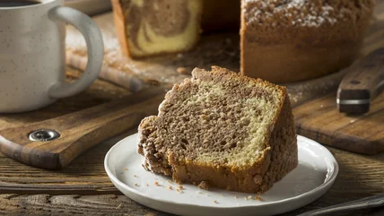 As for knowing when you're coffee cake is done, you want to gently press the center of the cake. If it is springy, that's a good start. Now, use a toothpick, insert it into the cake, then pull it out. If it comes out cleanly and there's nothing sticking to the toothpick, the cake is ready.