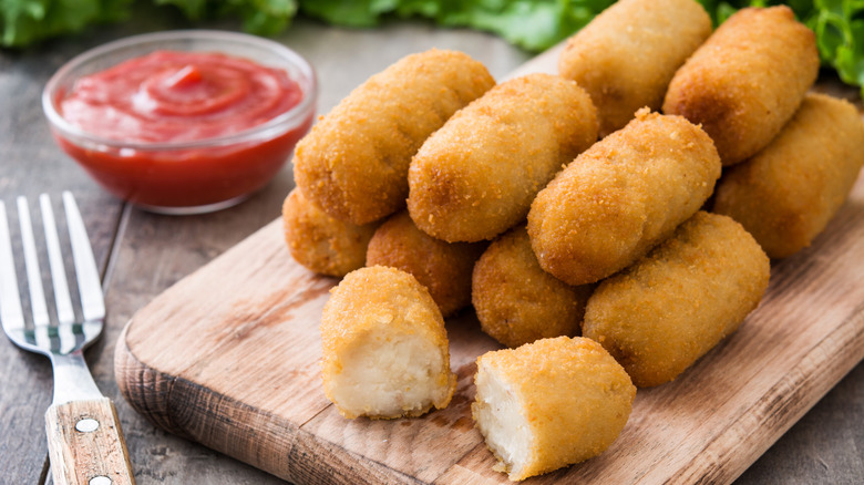 A croquette is a small, breaded, and fried ball of food, usually served as an appetizer. Typically, mashed potatoes or white sauce is used as the base and then combined with extras like chopped meat, shredded cheese, and vegetables. A pro tip is to stick to low-moisture add-ins so that the balls don't fall apart during cooking. But with that in mind, you can add in anything you want and give the repurposed potato salad a whole new life. The croquette is then rolled into a ball, coated in flour, egg wash, and breadcrumbs, and fried to golden-brown perfection.