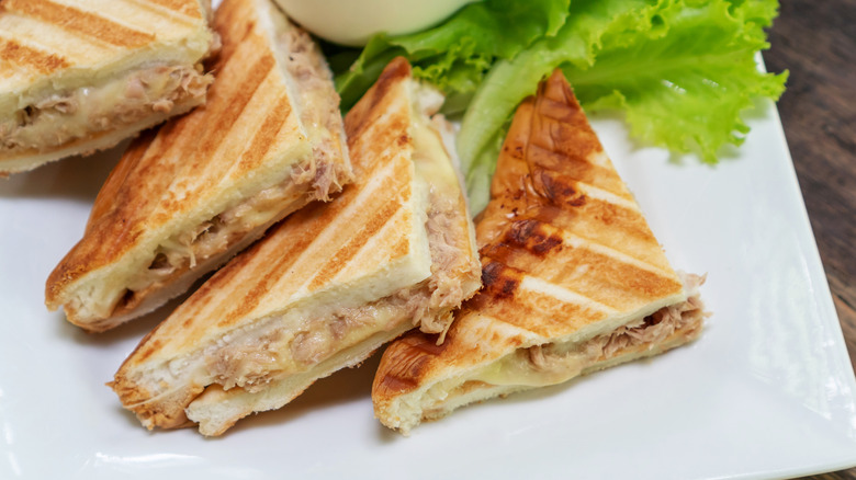 Slather your bread of choice with some butter, put in your cacio e pepe-infused tuna, and toast it on the stove in a pan or fire up the oven. On the stove, it typically needs to cook for two minutes on each side over medium-low heat, while in the oven it's recommended to cook it at 400 degrees Fahrenheit on a baking sheet for five to eight minutes or until the cheese looks melted. If you're looking to use your broiler, the sandwich needs to sit for about four minutes or until the cheese looks golden brown. Whichever way you choose to enjoy this savory twist on cacio e pepe, your tastebuds will thank you.