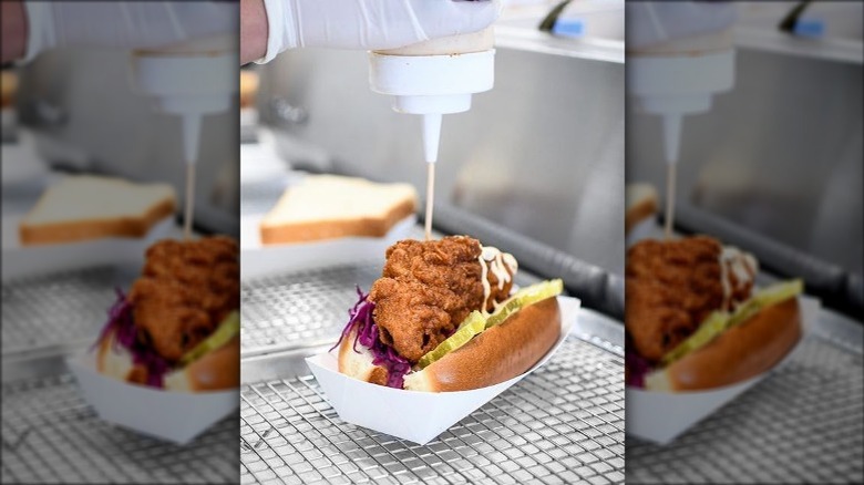 The sauce gets added to every hot chicken sandwich, along with another acidic element in the form of cider slaw. The final result is a dish that is not oversaturated because the sauce "balances out the whole entire chicken."