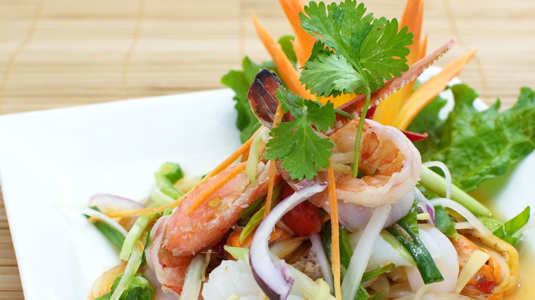 It's technically a salad, but it's definitely one of the more unusual salads out there. Instead of vegetables, larb uses finely minced or ground fish or meat (pork, chicken, or beef) mixed with toasted ground rice as its base. It further defies salad expectations by being quite spicy; the meat or fish is flavored with a substantial dose of fresh chiles, and is further customized to individual tastes with herbs, garlic, lime, onion or shallots, and — you guessed it — lemongrass.