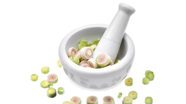 You can do this with the upper green stalk of the plant or with the tender inner core. Take the lemongrass and place it flat on the counter. Using a kitchen mallet, side of your knife, or any pounding implement you choose, apply pressure to crush the plant matter. Then slice the crushed stalks into large pieces. This method is primarily used for infusing lemongrass flavor into liquids such as soups or syrups. Mashing the leaves or stalks releases the essential oils so the lemongrass flavor and aroma can permeate into your recipe. Lemongrass stalks are very fibrous, so it's unpleasant to encounter a whole stalk in a dish. However, with this method, the mashed stalks are removed after cooking but before serving, so it's OK that they remain large, tough pieces — you won't be chewing them anyway. The large pieces are easy to find and remove from the finished meal.