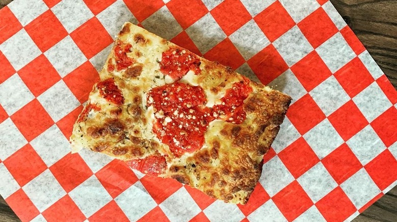 Boston has a few famous pizzas — from Regina's to Santarpio's — but this new joint in Charlestown is slinging slices from a different city altogether. Johnny Pomodoro serves square, Detroit-style pizza decked out with toppings ranging from glistening 'roni cups to Caesar salad ingredients. It's cooked in cast iron trays, which is what gives it that tell-tale crispy-edged crust, despite its thickness. Another hallmark of Detroit pies: The sauce is dolloped on post-toppings.