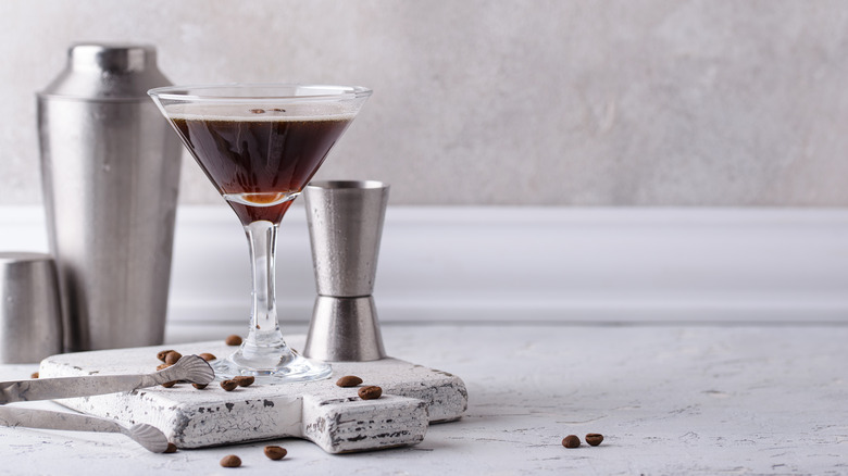 To make a shakerato at home, you'll need a cocktail shaker — hence the "shaken" part of the drink. After pouring a cup of coffee over ice in a shaker, de Laurentiis adds a shot of espresso and a little chocolate syrup. Then, the whole thing is shaken up, strained, and poured into a martini glass with a few espresso beans to garnish. The coffee and chocolate create a drink so delicious, it's basically a "liquid dessert," de Laurentiis says.