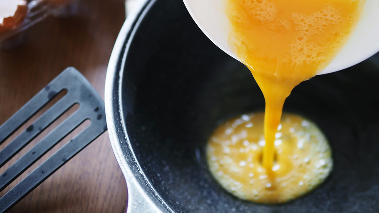 After the pan is heated, add some oil or butter to it so it coats the entire surface. When the oil is hot and shimmering, you're ready to add your pre-cooked ingredients and egg mixture.