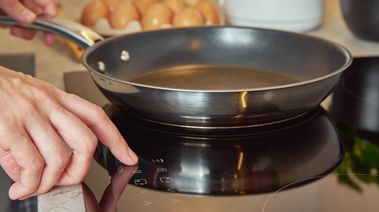 Set your pan on the stove over medium heat for a few minutes before adding oil or spices. Cast iron takes longer to heat up to the correct temperature, so be patient if you are preheating a cast iron skillet. You can tell that your pan is good to go when a drop of water sizzles and quickly evaporates as soon as it touches the surface. If the water droplet skids around the pan without evaporating, it's likely not hot enough yet. Conversely, if the water droplet evaporates instantly and the pan is smoking, it's too hot, and you should reduce the heat.