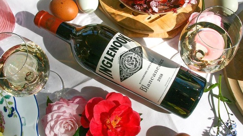 Blacaneaux white is the sister wine to Inglenook's signature Rubicon red. It blends organically grown marsanne, roussanne, and viognier to make a Rhone-style white wine with elegance, delicate refinement, and gorgeous appeal with a finish that lingers for days. The aromatic wine melds tropical mango and floral honeysuckle with crushed stone, peach blossom, and lemon curd flavors, creating a well-rounded mouthfeel.