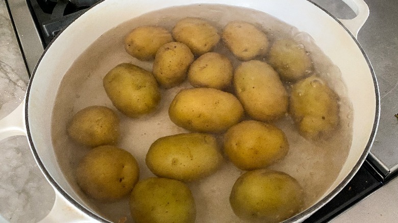 - Put the potatoes into a large pot and cover them with water. Bring them to a boil and continue to boil for 10 minutes or until they are tender.