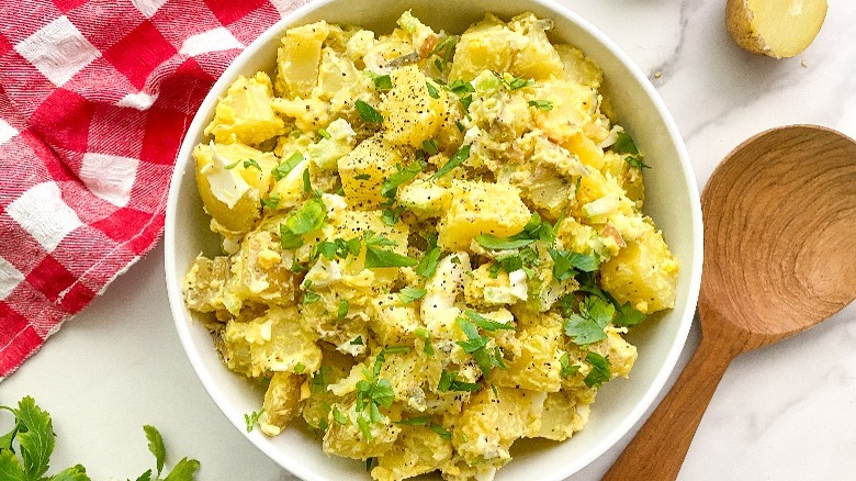We all know and love potato salad, a classic dish that we've been eating at picnics and barbeques for decades. A delicious variation is a Southern version typically made with yellow mustard, eggs, and sweet relish. Recipe developer Miriam Hahn says, "Potato salad has always been a family favorite. This one is a creamy and tangy side dish that is easy to make, and I love that it can be made ahead of time. When you put it in the fridge overnight the flavors have a chance to blend together, and it becomes even more flavorful on the second day."