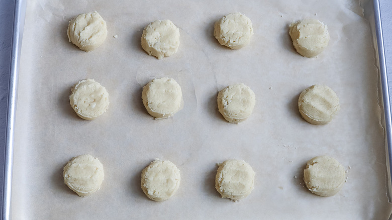 Scoop out about 1 ½ tablespoons of dough — Morone says this is equivalent to a medium cookie scoop, so you can use one of these instead if you have one in your arsenal. Plop the dough onto a cookie sheet, then repeat the process with the next cookie, placing it 2 to 3 inches from the first. Once you've filled up the first cookie sheet, start in on a second one. When you're done scooping, you should have about 24 cookies in all. Morone does say, "You can make them smaller or larger," adding that smaller cookies will require a minute or two less in the oven, while larger ones will require a minute or two more.