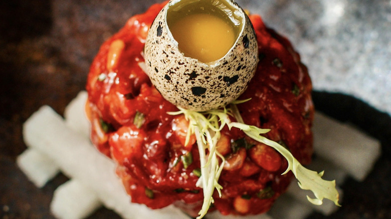 For example, the beef tartare, or yukhoe, is served in a ball on top of thin sticks of Korean pear arranged in a tic-tac-toe board, with the yolk of a quail egg still in its shell on top. The effect is stunning. Fans also love the Osamil burger, which is made with a half pound of beef and adorned with kimchi bacon jam.