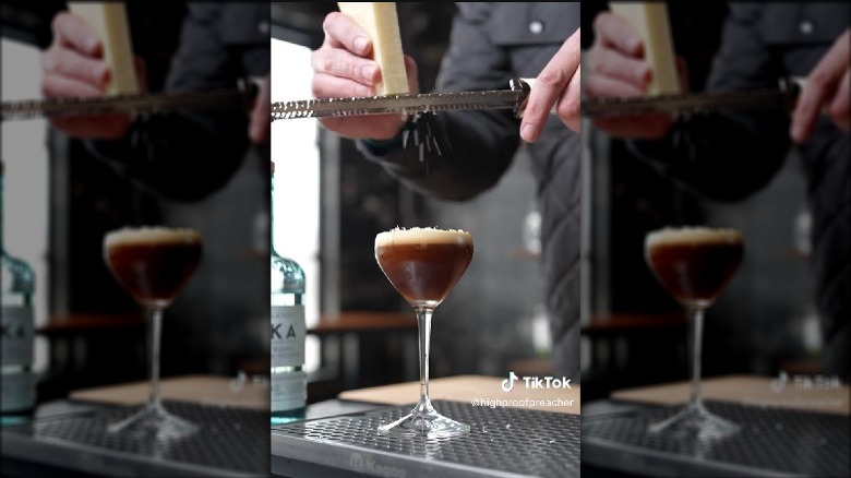 One of the original proponents of the drink suggests using aged parmesan cheese. Though you may be tempted to use a knife to chop off pieces of cheese onto your drink, take extra time to shave finer pieces over your glass with a Microplane. The idea is to deliver flavor, not mimic a gooey serving of macaroni and cheese. When you're able to nail the perfect proportion of ingredients, the bitterness of the espresso will be balanced by the savory, salty presence of the cheese. Espresso martinis garnished with parmesan are much more than a social media fad; this flavor duo has proven staying power.