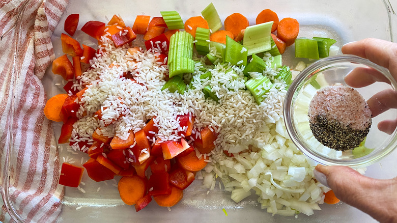 - Spray a 9x12-inch baking dish with cooking spray. Add the onion, garlic, carrots, celery, red pepper, rice, diced tomatoes, boiling water, Italian seasoning, fennel seeds, salt, and pepper. Stir and put into the oven uncovered, for 15 minutes.