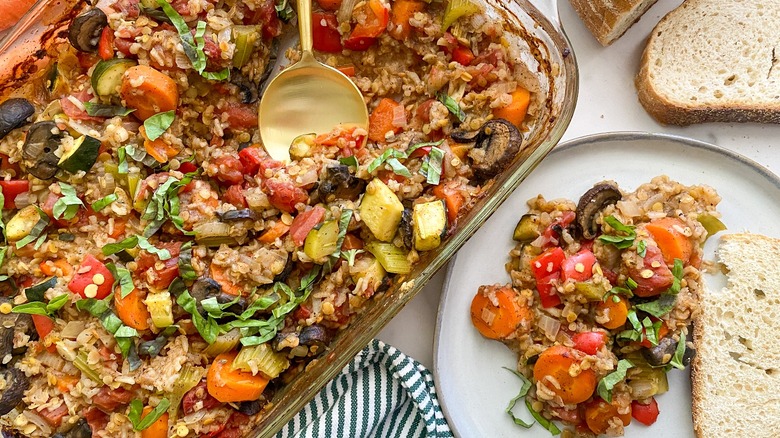 Recipe developer Miriam Hahn brings us this recipe and says, "I'm always looking for one-pot meals that are easy to throw together and taste delicious. This recipe has a variety of hearty veggies along with rice and lentils making it a complete balanced meal. If you want to jazz it up, you can top the casserole with a layer of your cheese of choice for some melty goodness on top or some simple Parmesan."