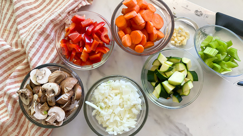 - Dice the onion and mince the garlic. Slice the carrots and celery into small chunks. Chop the red pepper and zucchini and slice the mushrooms.