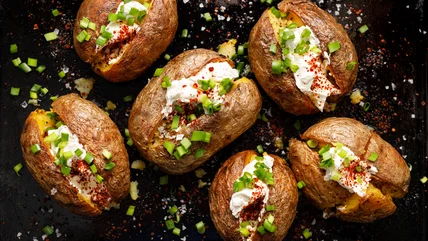 A baked potato, whether prepared simply with butter or loaded with all the fixings, is perhaps one of the tastiest side dishes and a staple on nearly every steakhouse menu. The crisp outer potato skin combined with a soft, fluffy interior is irresistible. But when it comes to making baked potatoes at home, it can be a lengthy endeavor. The standard cooking time for a baked potato can range from an hour to 90 minutes.