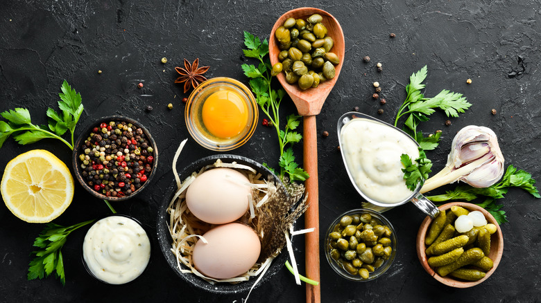 When you're in a rush, you can whip up a quick four-ingredient tartar sauce by combining mayonnaise, chopped pickles (or relish), yellow mustard, and lemon juice. However, if you're looking for a more refined homemade tartar sauce, substitute the yellow mustard for Dijon and add ingredients like capers, cornichons, and Worcestershire sauce. The variations don't end there. For example, you can try using aioli instead of mayonnaise. This substitution results in a thinner sauce with strong notes of garlic. Alternatively, you can experiment with herbs. Tarragon and dill are classics but parsley, rosemary, and basil are also excellent for freshening up your sauce. If you're feeling hesitant about experimenting, just remember — it's really difficult to mess up tartar sauce.