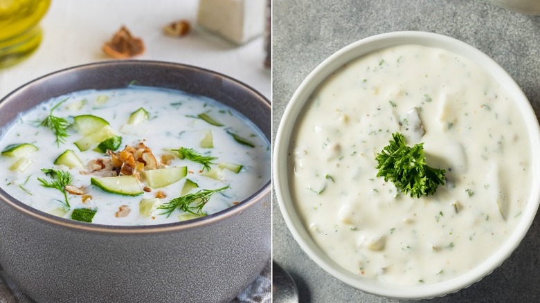 Although the three terms resemble each other, they don't have much in common. Tartar sauce, as we know, is a mayonnaise and pickle-based sauce often served with fried seafood dishes. Tarator has a few different meanings, depending on where you find yourself. In Levantine cuisine, tarator is a tahini-based sauce often paired with falafel or beef shawarma. In addition to tahini, it contains lemon juice, water, and salt. Nearby in Turkey, tarator is a walnut-based sauce made with breadcrumbs, garlic, olive oil, and lemon juice. Similar to tartar sauce, it's usually served with fried calamari. To add to the confusion, tarator is also the name of a cold soup from the Balkans made out of cucumbers, yogurt, walnuts, and dill.