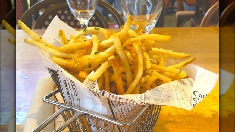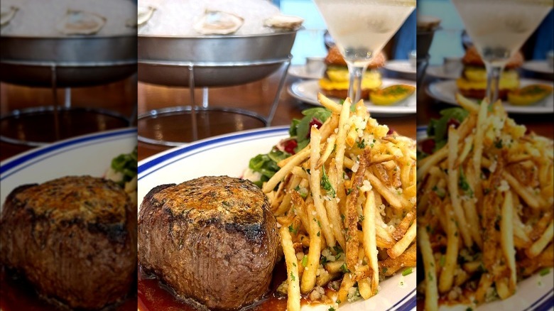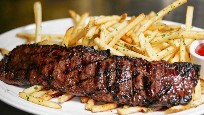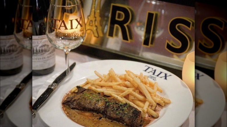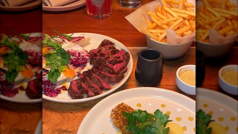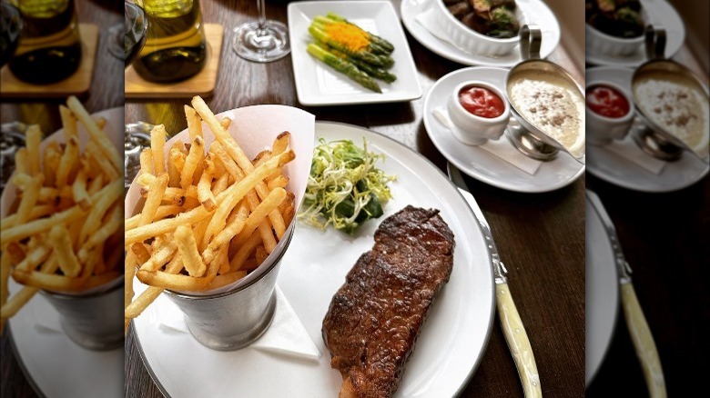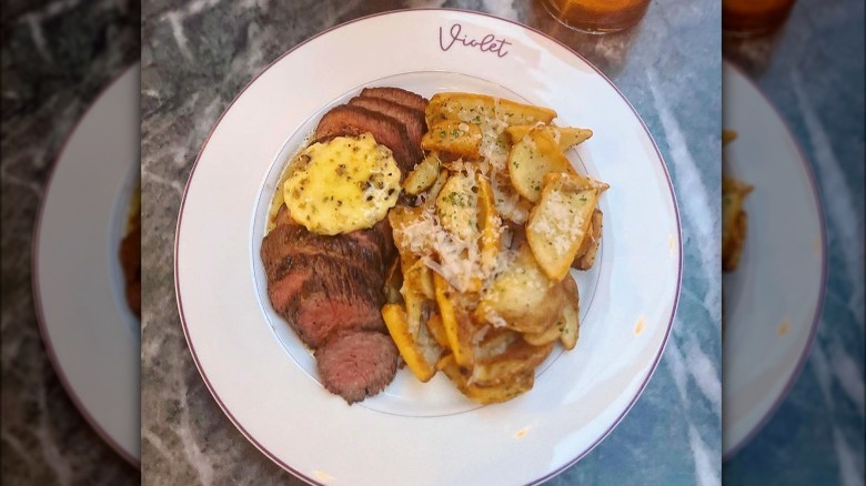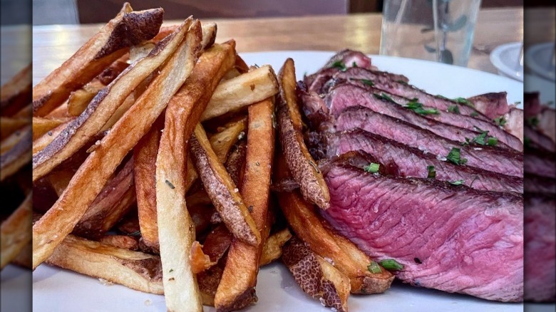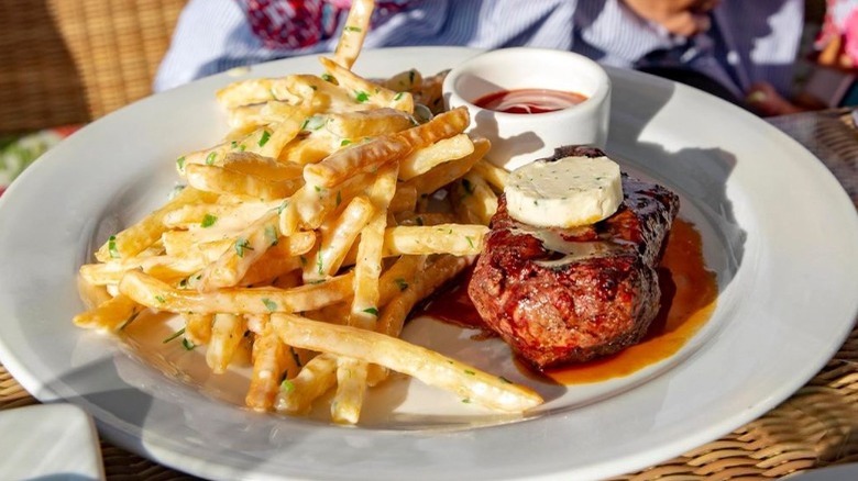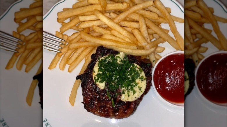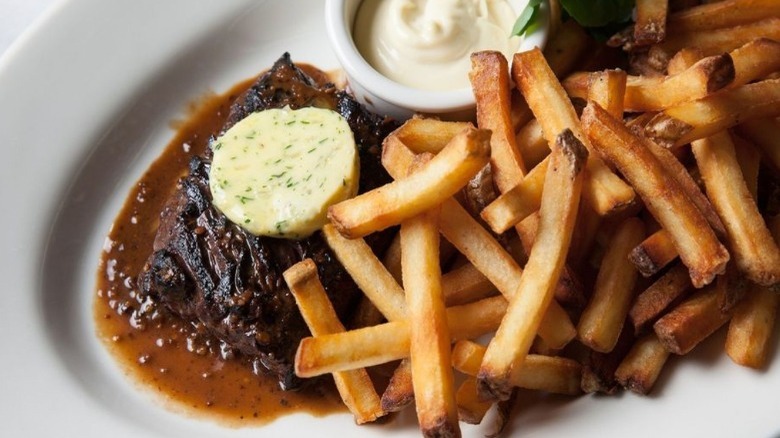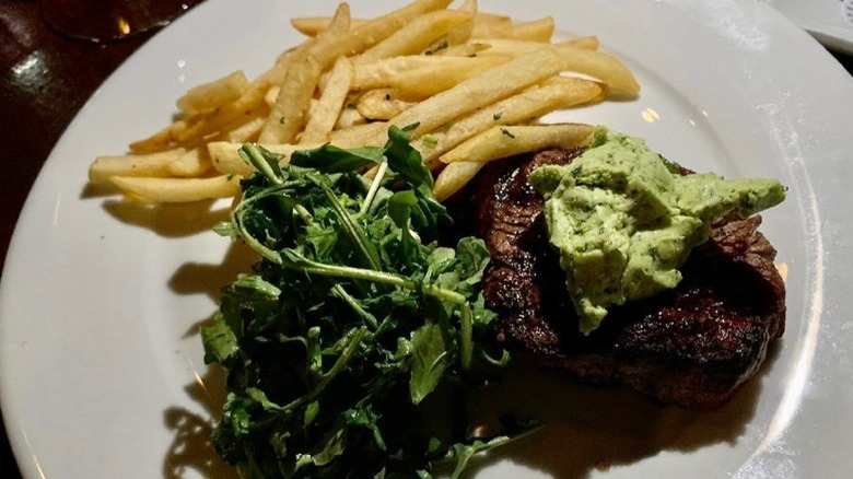 Once you scoop through the cheese, you'll be treated to hunks of bread that have soaked up the salty, caramelized broth chock-full of onions and veal stock. That said, Lumiere Brasserie also happens to serve some great steak frites worth writing home about. The fries are served alongside a prime ribeye filet, one of the most tender and flavorful cuts of steak. This dish is topped with beurre mâitre d'hôtel, which is a compound butter packed with parsley, prepared with a hit of lemon, and finished with salt and pepper.