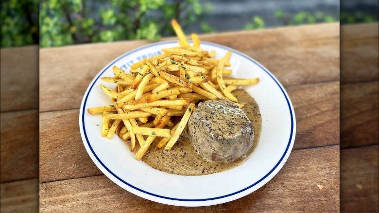 After digging into Monsieur Marcel's steak frites, you'll come to understand how the restaurant has held down a spot at the Grove's bustling Original Farmers market for over two decades. Monsieur Marcel's steak is a thin, juicy, and tender cut of Black Angus ribeye. The generous portion of steak is served alongside a pile of herby, salty pomme frites and a gravy boat of rich, flavorful green peppercorn sauce. At only $35, the dish is one of the more affordable plates of great steak frites in town.