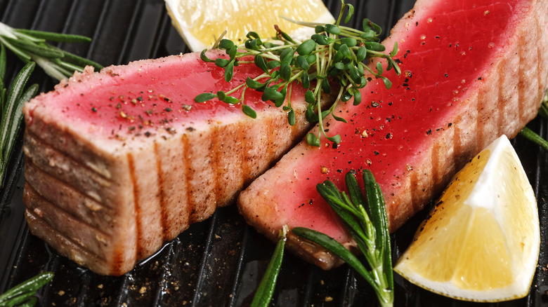 Beyond keeping the bone intact, he offers another recommendation to prevent a dry interior: Don't be afraid to undercook swordfish. "People think because it's a white-flesh fish that it has to be cooked all the way through, but that's not the case," he tells us. Per Blais, you should cook swordfish just a little longer than you would ahi tuna. His sweet spot is medium-rare to medium, adding that a little bit of "translucency" in the middle of the fish is no problem.