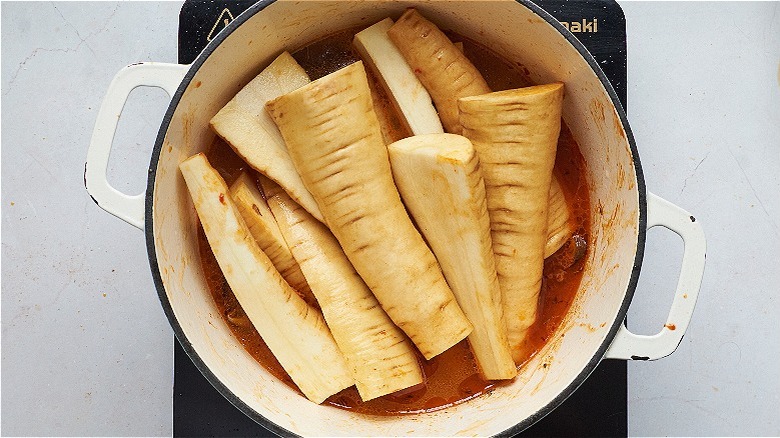 - Add the parsnips, submerging as much as possible. Carefully stir the parsnips to coat each one in broth, then cover the pot and turn the heat to medium-low. Cook for 1 hour, or until the parsnips on top are very soft.