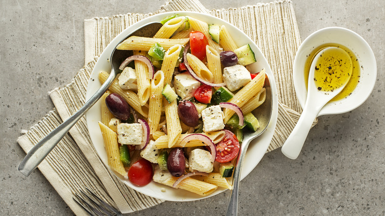 Pasta salad lends itself to a world of delicious possibilities. Although there aren't really many rules for what exactly should go into the starchy salad aside from pasta itself, the best renditions tend to juxtapose all sorts of flavors and textures. Yet, while a mix of ingredients can give salad pizzazz, certain additions can also be the very pitfall of a pasta salad. Depending on the variety, cheese can actually be one of those iffy ingredients.