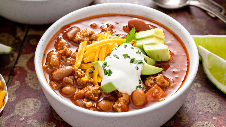 Butternut squash in a comforting bowl of chili sounds seasonal, but it doesn't seem so compatible with chili's consistency and typical flavor profile. We know some like to start their chili off with a few sautéed vegetables such as carrots, onions, and celery, also known as a mirepoix, but these ingredients cook until translucent to solely release extra flavor without changing the texture of your chili very much. On the contrary, heartier veggies with a higher starch content can often thicken it up, and butternut squash not only accomplishes that but adds a boost of nutrients.