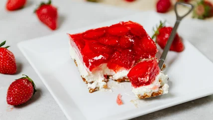 Strawberry Pretzel Salad is a sweet and salty three-layered dessert with a crust composed of salted pretzels, butter, and sugar, and a middle layer consisting of cream cheese, sugar, and Cool Whip. The top layer is where the Jell-O comes in – strawberry-flavored Jell-O and sliced strawberries are combined to create a shiny, refreshing, bright red finish.