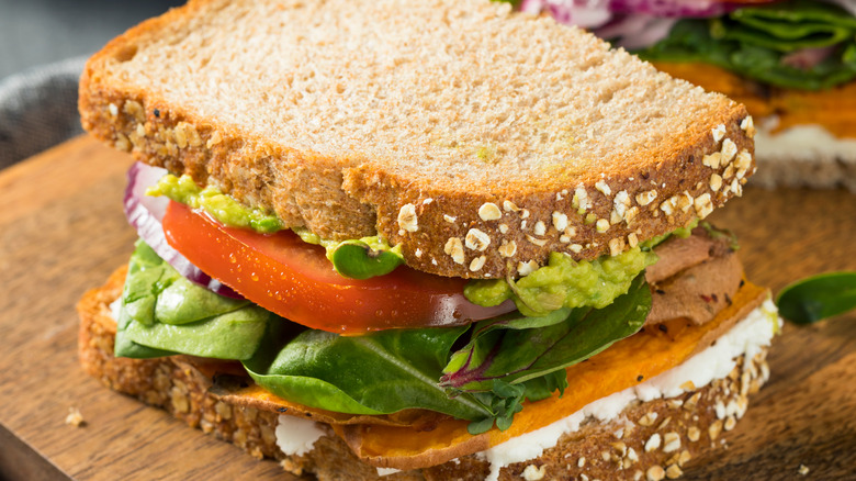 It seems as though diners were more receptive towards Evelyn's namesake sandwich than her husband's (or at least it wasn't singled out by The Cheesecake Factory executives as a flop). Evelyn's Favorite was a light, vegetarian creation that wouldn't have looked out of place on the menu of a 1970s Californian health-food café — it was basically a salad on bread, combining avocado, mushrooms, alfalfa sprouts, cucumbers, tomatoes, and cream cheese. Sunflower seeds added some crunch. If you took out the cream cheese, it would even be vegan.