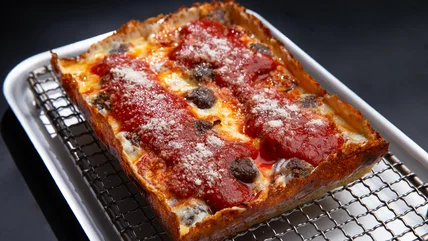 The hallmarks of a true Detroit-style pizza are an airy, spongy, rectangular crust with a crispy exterior and browned cheese all the way to the edges. But the real kicker is the order of the toppings: On top of the crust goes, (in ascending order) cheese, then pepperoni (or whatever else), then sauce. Putting sauce on top keeps the crust from getting soggy, but on the flip side, it also keeps the pepperoni from getting crispy — a trade-off fans of the style say is totally worth it. With all this layered, saucy, cheesy goodness in mind, are you on team knife and fork, or do you consider pizza (now and forever) a handheld food?