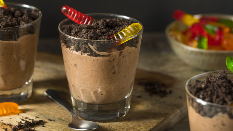 Since sandwich cookies already merge chocolate and vanilla flavors, they're a natural complement to either pudding flavor. You can use the original chocolate-vanilla cookie flavor or any variety of sandwich cookies. The cookies can be layered with the pudding parfait-style or swirled in throughout the pudding, but the layer on top is what gives dirt pudding its eponymous appearance.