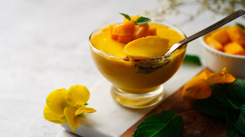 Bright and luscious, mango is a popular pudding flavor worldwide. Mango is naturally sweet so mango pudding uses less added sugar than other pudding flavors. Although it's very sweet, mango has enough tartness to it to keep it from becoming overly sweet or sickly. Sometimes, citrus juices are added to increase the tartness. It's frequently made with coconut milk for a tropical and refreshing summertime snack, and may also be made with sweetened condensed milk.