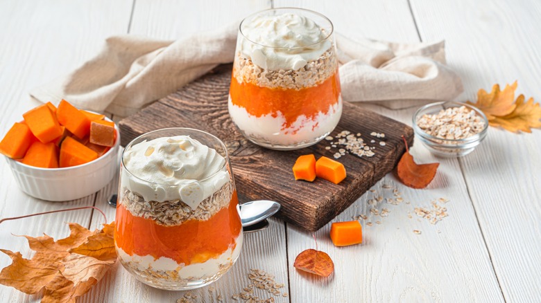 Pumpkin pudding is an even richer, more decadent spin on the quintessentially seasonal pumpkin spice latte. It's a great way to use up leftover pumpkin puree from holiday meals or from an over-abundant fall garden. Pumpkin puree gives a pulpy, fluffy texture to the pudding and adds a hearty helping of fiber to boot. In pumpkin pudding, a standard baked or boiled vanilla pudding gets a measure of pumpkin puree and baking spices, which may include cinnamon, allspice, ginger, nutmeg, and cloves. These warming fall seasonings perk up bland pumpkin, and their spicy bite balances against the pudding's creamy lusciousness.