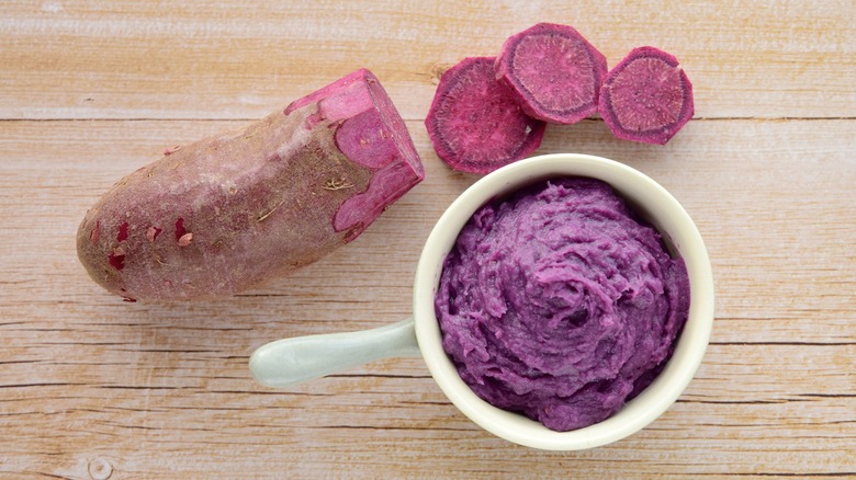 As a yam, ube is large and tough so it must be peeled, chopped and boiled or steamed before it's added to a pudding. The starch in the cooked, mashed ube thickens the uncooked pudding as it takes on the ube's color. Ube's appeal goes beyond its dazzling appearance, it also has a distinctive, complex yet subtle taste. If you haven't yet tried this screaming violet tuber, you definitely should.