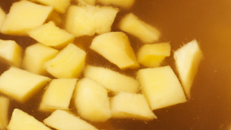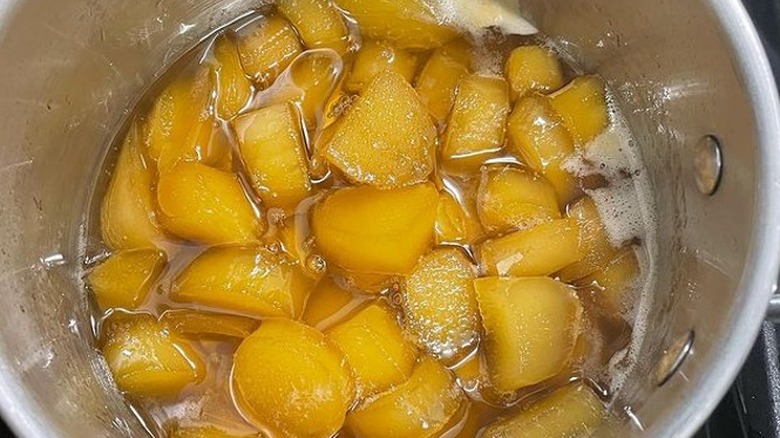When you're ready to cook, peel the ginger with the help of a spoon and then cut it into chunks about an inch long. Then poach them by placing them in a pan and adding enough water to cover them. First, boil the ginger and water, then reduce the heat and simmer for an hour or two. The ginger should be tender after that time.