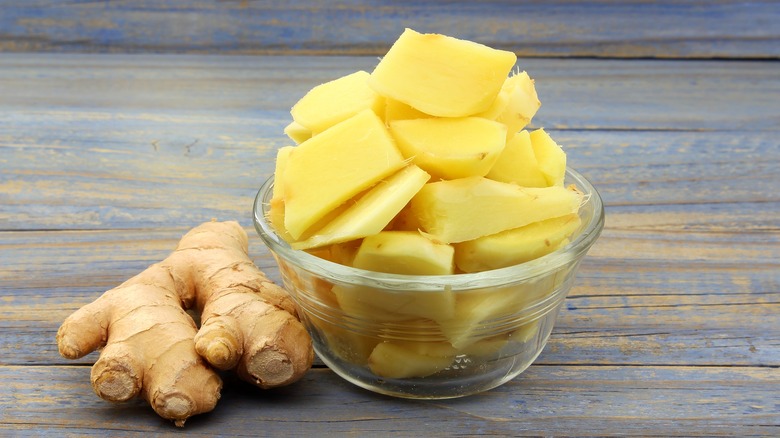 Ginger itself doesn't have much in the way of calories, vitamins, or minerals, but it's prized for its healing properties, thanks to the presence of gingerol. Fresh ginger is a known balm against nausea and stomach upsets, and there are studies that indicate it can be used as an anti-inflammatory as well. Unfortunately, the same cannot always be said of stem or crystallized ginger, because both need to be poached for long periods of time, and studies have shown that boiling ginger at higher temperatures can have a negative impact on the root's purported medicinal properties.