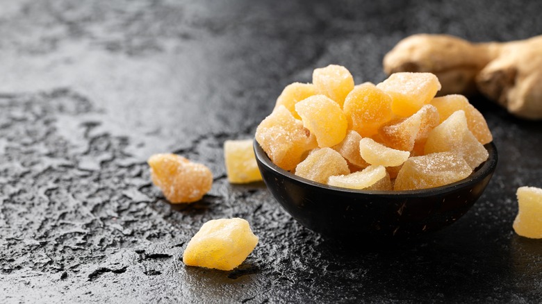 Stem ginger isn't the only type of sweetened ginger available, as there's also crystallized ginger — an ingredient that can be found on both sides of the Atlantic. The difference between the two comes down to the way they're made. Crystallized ginger is stem ginger that has been further poached until the root itself becomes translucent. The cooked ginger is then taken out of its liquid and air-dried before being rolled in granulated sugar.