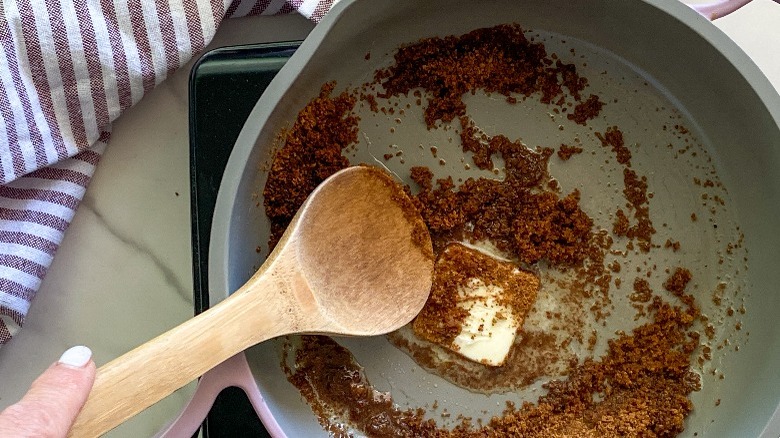 - Add the butter and sugar to a medium pot and bring heat to medium. Stir to melt the butter and sugar for about 5 minutes, then add the cinnamon and salt.