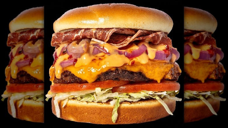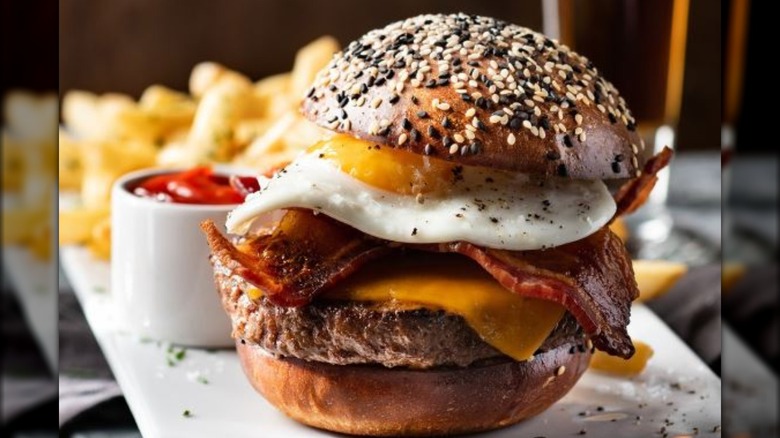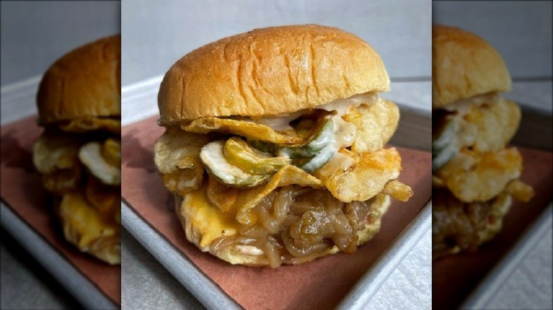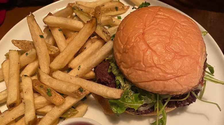 Nowadays, there's no shortage of plant-based hamburger options. Some protein alternatives veer far outside the realm of the familiar, while others choose to remain faithful to traditional beef burgers, serving as a gateway to curious carnivores. Picking the latter approach, Beleaf Better Burgers is a pop-up fast food spot that's filling the bellies of hungry southern Californians. Cozily sandwiched between two buns is their signature Beleaf Smash Burger. To say it's loaded is to put it lightly. It comes with two smashed Impossible patties, sliced pickles, caramelized onions, and house sauce while melted cheese cascades down the sides.