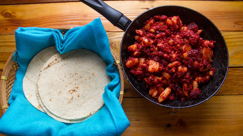 The explorers brought pigs with them on their journeys across the Atlantic, and when they discovered a treasure trove of new spices and chili peppers in America, they naturally implemented them into cooking and curing methods they already knew. This is ultimately how both types of chorizo were born. Beyond their origin and a few similar ingredients, though, Spanish and Mexican chorizo are very different from each other. While Spanish chorizo is cured, dried, and ready to eat, you don't dare want to chomp into a raw link of Mexican chorizo.