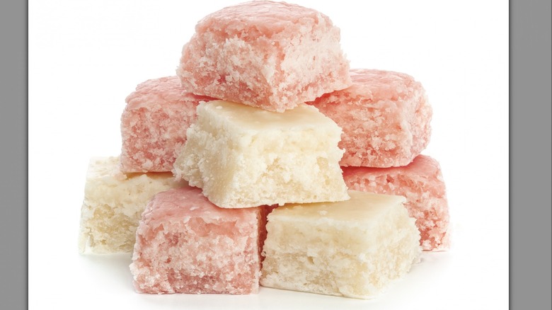 With a name like coconut ice, it's easy to imagine some type of frozen treat. Maybe something along the lines of Italian ice or a slushie. But this dessert's name is very misleading. There's no ice in coconut ice — it's actually a room-temperature sweet with a long history. But this confection does feature a lot of coconut flavor.