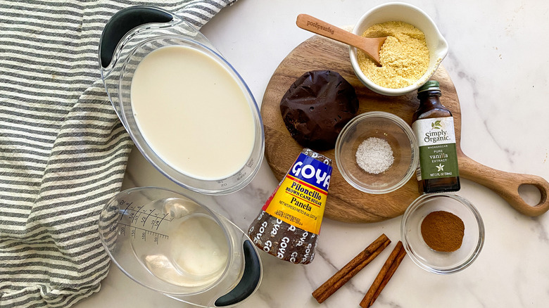 To make this recipe, you'll need some standard American hot chocolate ingredients like milk, ground cinnamon, cinnamon sticks, vanilla, salt, and hot water. To make true Mexican drinking chocolate you'll also need to gather piloncillo sugar, Mexican chocolate, and masa harina.