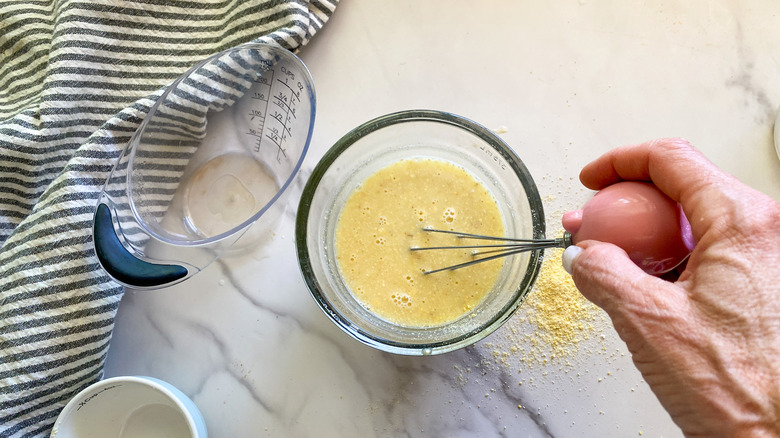 - In a small bowl, combine the hot water and masa harina. Stir with a whisk to break down any lumps.
