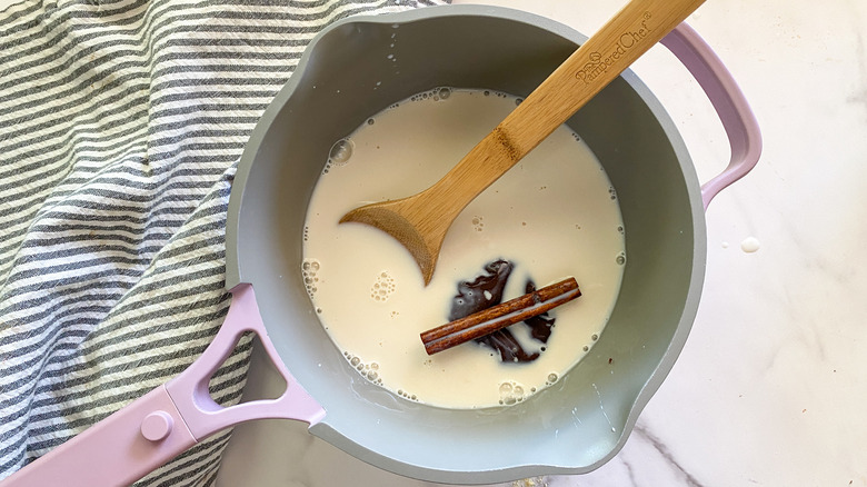 Since the chocolate and sugar are in solid form, we'll start by combining them with the milk and the cinnamon stick in a medium pot over medium heat. "The piloncillo is very hard and can be tricky to break apart. Use a heavy knife to cut into it and keep sawing back and forth until a chunk breaks free," Hahn remarks. Stir for about 5 minutes until everything is dissolved, then remove the cinnamon stick.