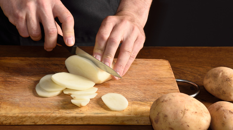 Mashed potatoes are not just about what you can add to them — there's also a significant technical component that is often neglected. Luckily, Chef Alton Brown has us covered. Brown cuts his potatoes in triangles before boiling them for the "perfect range of doneness and starch-gelatinization," (via YouTube). Alton recommends using a utility or a chef's knife to cut the potatoes into pieces like a pizza, then boiling the slices to get the perfect Thanksgiving side dish. In his recipe, Brown notes that the cooking time on these potato wedges should be about 15 to 20 minutes. The potatoes will be done when they can be easily smashed with tongs.